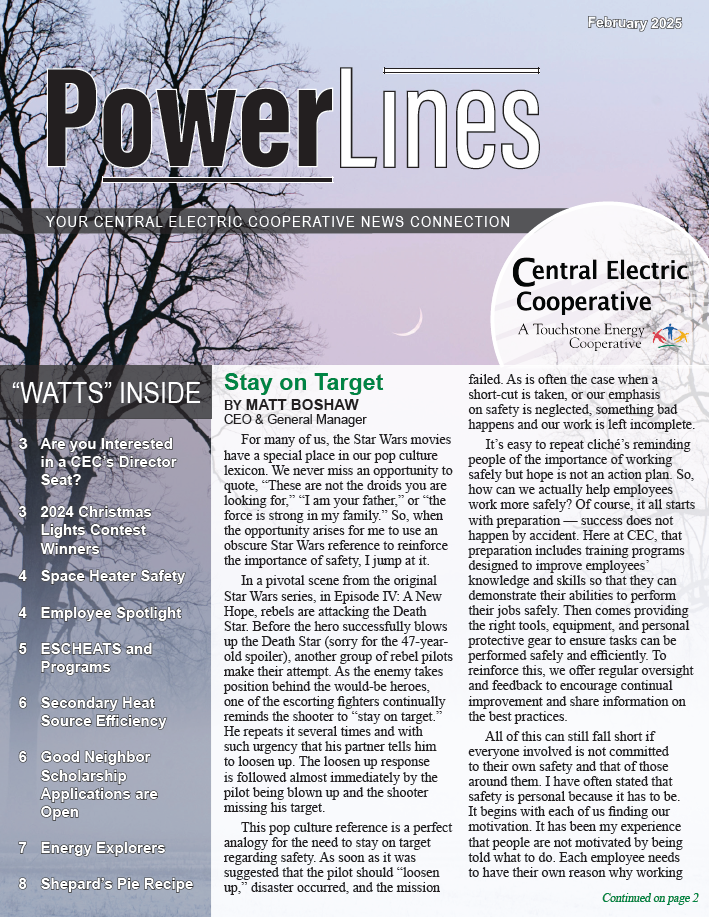 February 2025: Are You Interested in a CEC Director Seat?, 2024 Christmas Lights Contest Winners, Space Heater Safety, Employee Spotlight, ESCHEATS and Programs, Secondary Heat Source Efficiency, Good Neighbor Scholarship Applications are Open, Energy Explorers, Shepard's Pie Recipe.