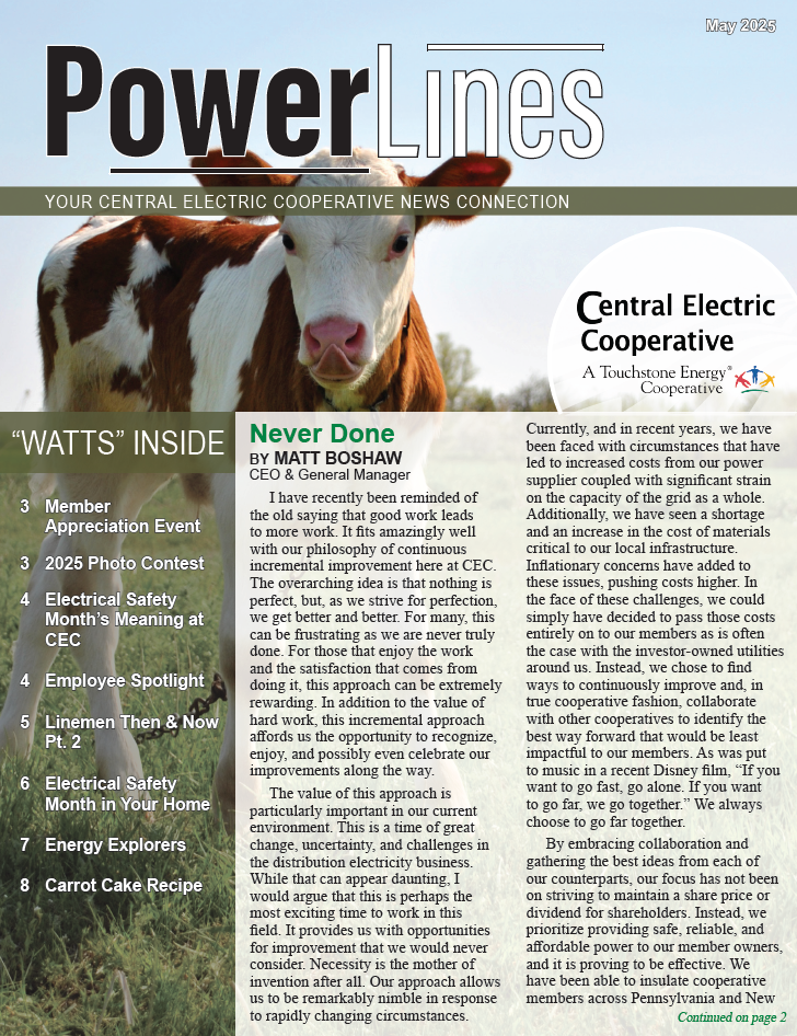 May 2025: Member Appreciation Event, 2025 Photo Contest, Electrical Safety Month's Meaning at CEC, Employee Spotlight, Linemen Then & Now Pt. 2, Electrical Safety Month in Your Home, Energy Explorers, Carrot Cake Recipe.